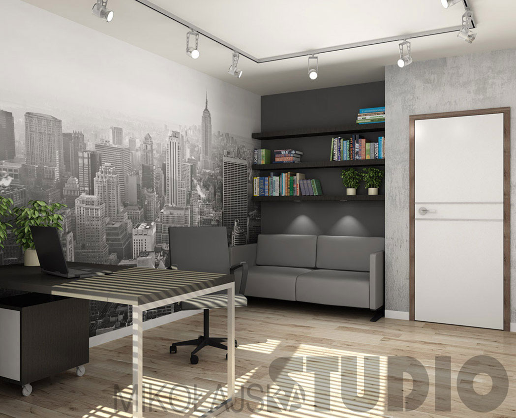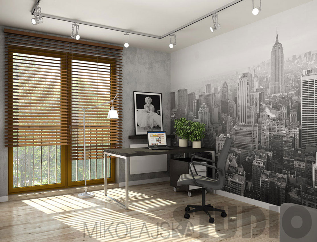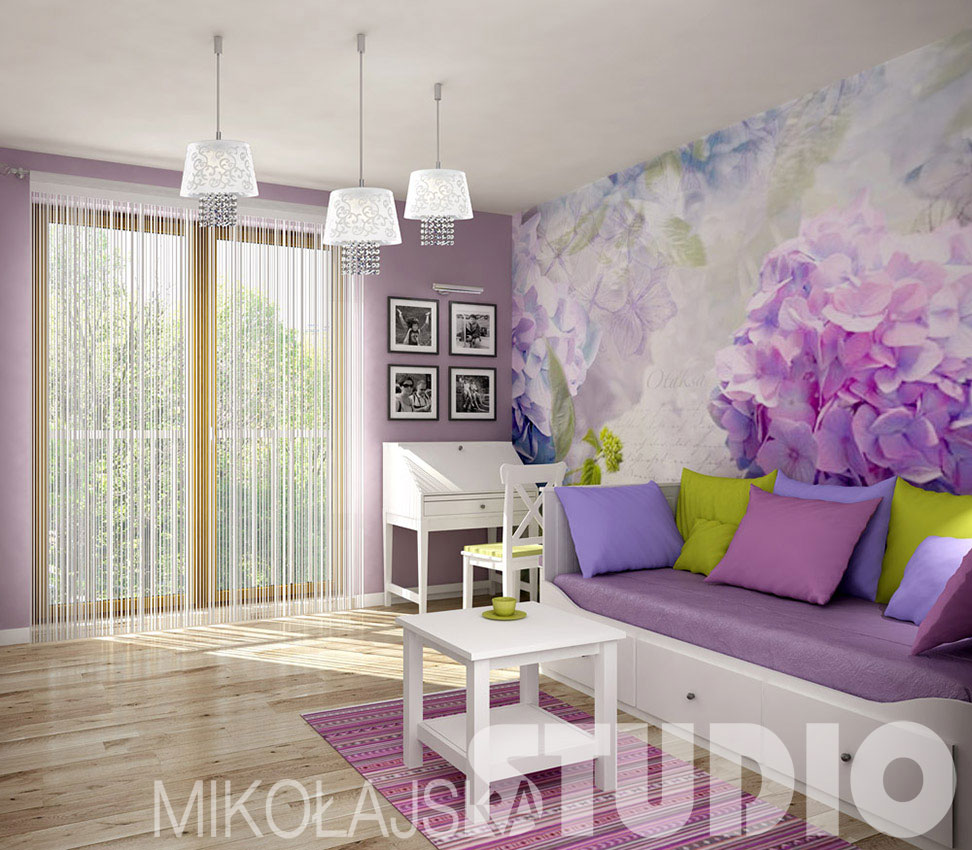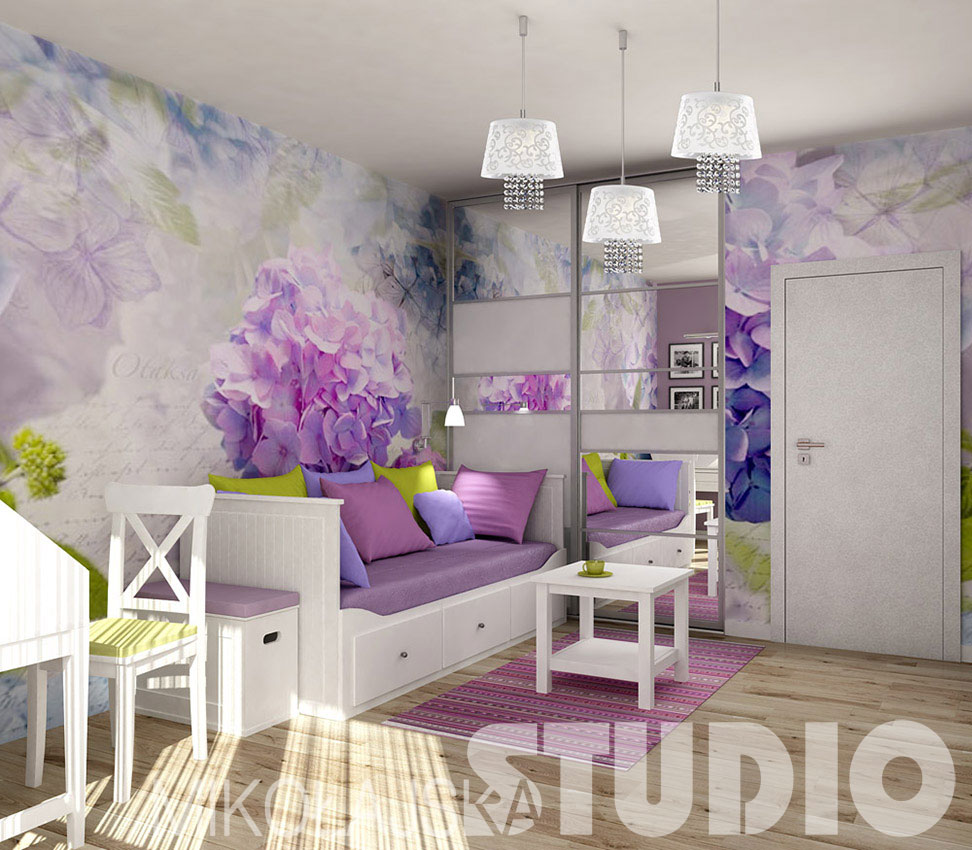 Starsze nastolatki czują się już bardzo dorosłe i często lubią wokół siebie szarości i czernie, żeby podkreślić swoją powagę. Pokój z czarno-białą fototapetą Nowego Yorku z meblami wykończonymi fornirem bejcowanym na czarno powinien spełnić takie oczekiwania. Trochę metalowych elementów, oświetlenie szynowe na suficie spowodują, że całość będzie miała lekko techniczny charakter „loftu” czy „studia”. Odrobina zieleni na biurku i półce złagodzi surowość wnętrza, a jasna podłoga z desek go rozświetli. Taki zestaw kolorystyczny możemy zastosować w dobrze doświetlonym pomieszczeniu (tu mamy duże podwójne drzwi portfenetre). W przypadku małej powierzchni pokoju i niedużego okna lepiej jest stosować jaśniejsze kolory.