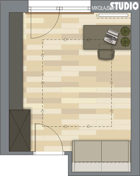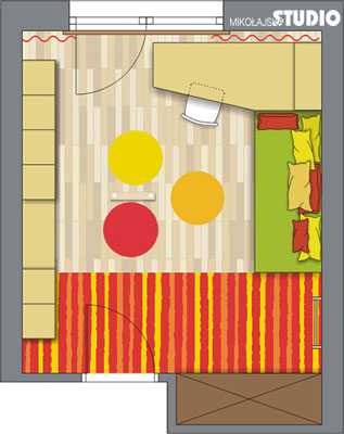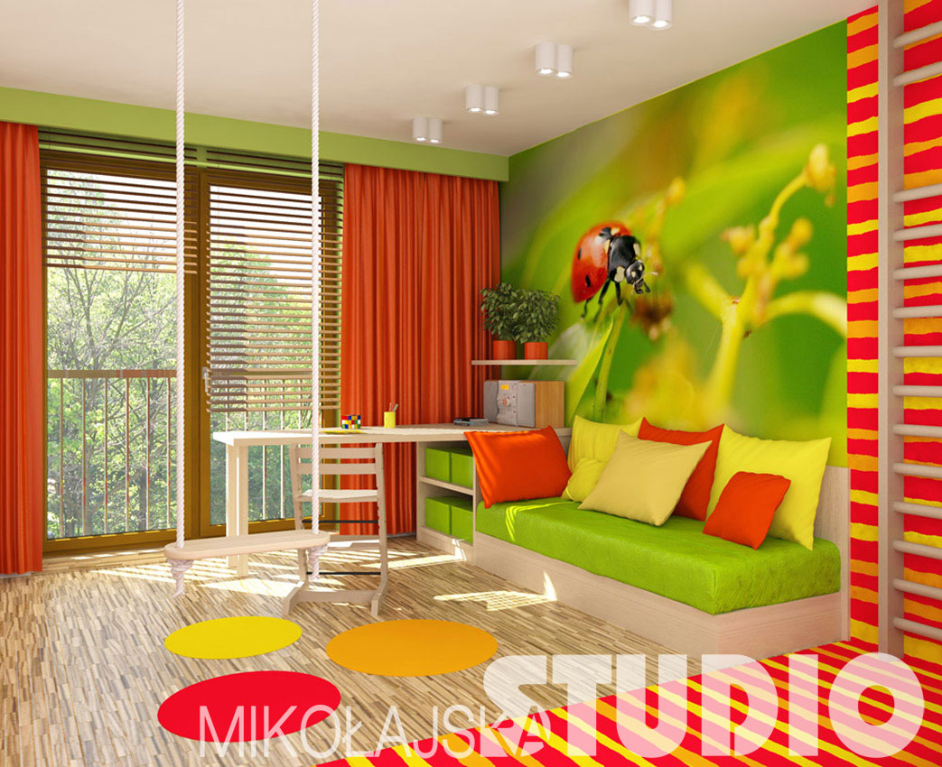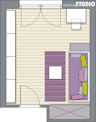 Maluch mieszkający w tym pokoju na pewno będzie patrzył optymistycznie na świat. Żywe, wesołe kolory, drabinka na którą można się wspinać, a pod nią dywan. Oświetlenie tak rozmieszczone, żeby można było zawiesić na środku pokoju huśtawkę (można wymieniać ją na huśtany fotel z IKEA, drabinkę, kółka do przewrotów lub linę do wspinania się). Mebelki są z IKEA – system Traby. Mogą rosnąć wraz z dzieckiem. Po prostu dokłada się kolejne piętro systemowych elementów. Krzesełko tripp trapp to kolejny świetny przykład mebla rosnącego wraz z dzieckiem od niemowlaka do dużego nastolatka. Dzięki niemu stół od początku jest na właściwej wysokości i nie trzeba go wymieniać. Mamy jeszcze szafę wnękową która jest potrzebna w każdym wieku. Oprócz tego standardowy młodzieżowy tapczanik i biurko zrobione na zamówienie jako element ograniczający tapczanik od strony głowy, tak, by można było oprzeć o coś poduszkę. Biurko powinno być przykręcone do płyty za tapczanem, żeby się nie przesuwało podczas opierania. Po wymianie fototapety (można dokładnie taką zamówić w firmie Fototapeta24) i zmianie kolorów dodatków otrzymamy pokój dla starszego dziecka.