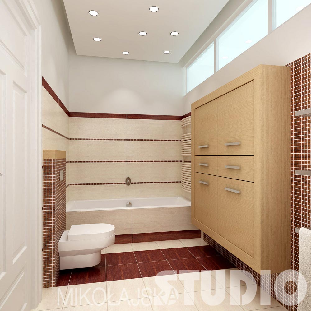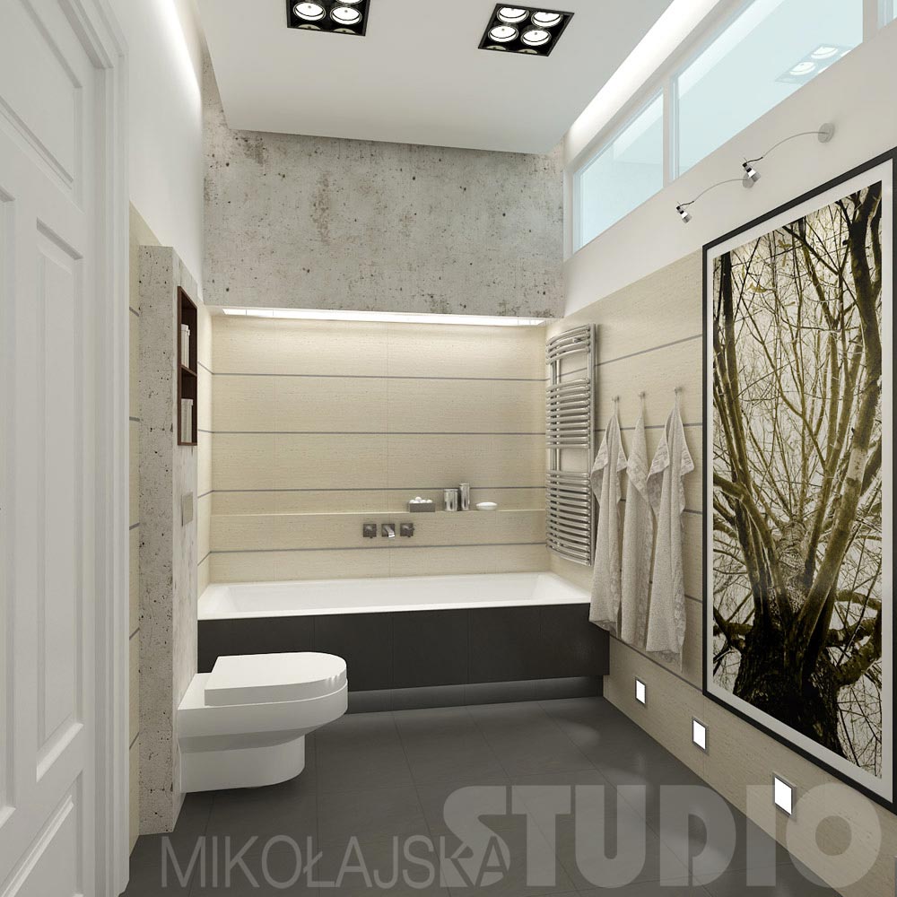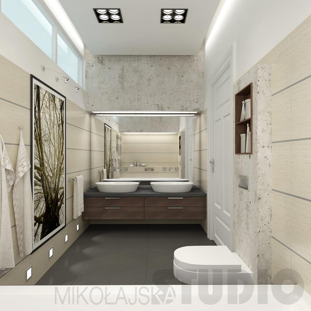 Ascetyczna forma. Na jednej z krótszych ścian zawiesiłam drewnianą szafkę z ciemnym blatem. Na niej stoją dwie umywalki Emani firmy Keramag. Za nimi na całej płaszczyźnie ściany przyklejone jest lustro. Ścienne baterie do umywalek zamocowane są do jego płaszczyzny. Przy przeciwległej krótkiej ścianie znajduje się zabudowana wanna. Nad nią, tak jak i nad umywalką umieściłam dwie bryły z płyt kartonowo – gipsowych imitujących beton. Wykończone są mieszanką cementu i kleju, specjalnie barwione i impregnowane. U spodu bryły wbudowana jest podłużna lampa. Ściany łazienki wyłożone są płytkami gresowymi imitującymi trawertyn. Pomiędzy płytkami wmontowane są metalowe nierdzewne listwy.