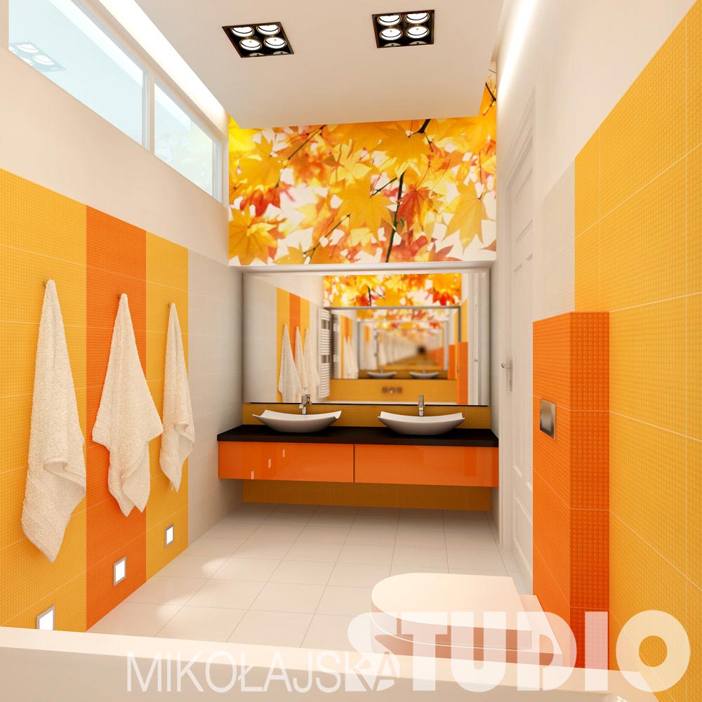 Ozdobą łazienki są bardzo zdecydowane kolory i kubistyczne formy. Zastosowałam pomarańczowe, żółte i białe płytki ścienne z kolekcji ecco Firmy Polcolorit wykończone geometryczną fakturą. Na szafce z blatem stoją dwie umywalki Magdalena hiszpańskiej firmy Bathco. Odbijają sięw dużej płaszczyźnie lustra umieszczonego za nimi. Za wanną też zamontowane jest lustro. Nad umywalkami i wanną zawiesiłam bryłę z mlecznego pleksi. W środku znajdują się są świetlówki. Na przedniej ścianie świecących brył nadrukowane jest zdjęcie jesiennych liści.