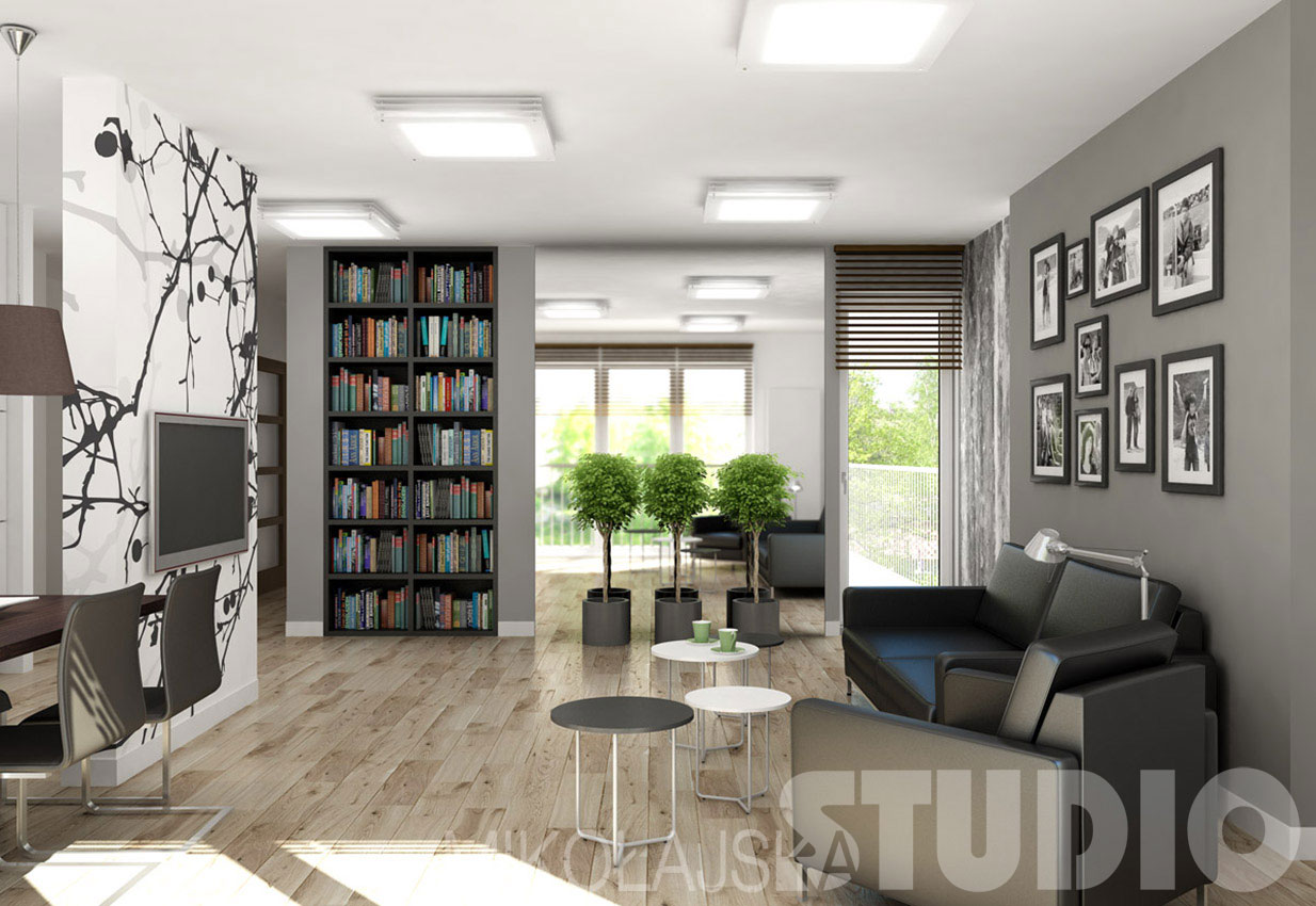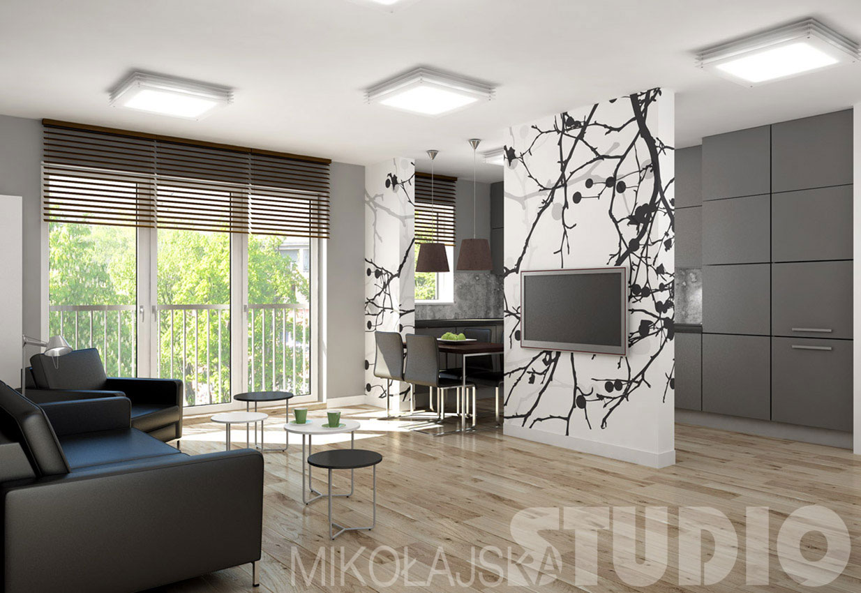 Wnętrze dość purystyczne, dla osób potrafiących systematycznie utrzymać wzorowy porządek stylowy i kolorystyczny. Konsekwentnie czarno-białe z odcieniami szarości i bielą, z drobnymi „ocieplającymi” je wyjątkami – wybieloną podłogą – ale jednak zachowującą kolor drewna, drewnianymi ciemnobrązowymi żaluzjami i stołem. Kanapa i fotel na tle ściany w ciemno-popielatym kolorze. Ściana z płyt gipsowo-kartonowych wysunięta do przodu, zza niej światło na fototapetę naklejoną na ścianę konstrukcyjną. Fototapeta to czarno-białe zdjęcie slabu trawertynu. Na ciemnej ścianie fotografie rodziny. Zamiast kredensu we wnęce – biblioteczka. Na ścianie naprzeciwko okna wielkie lustro odbijające światło, rozjaśniające i powiększające pomieszczenie. Na jego tle zieleń. Kuchnia od pokoju jest częściowo oddzielona „rozciętą” ścianką i stołem jadalnym. Ścianka na której wisi telewizor wykończona jest fototapetą Botanic firmy Artofwall. Meble w kuchni są w grafitowym kolorze, neutralne, stanowią atrakcyjne tło dla ładnej fototapety. Kuchnia nie ma dominować, stanowi eleganckie „zaplecze usługowe”.