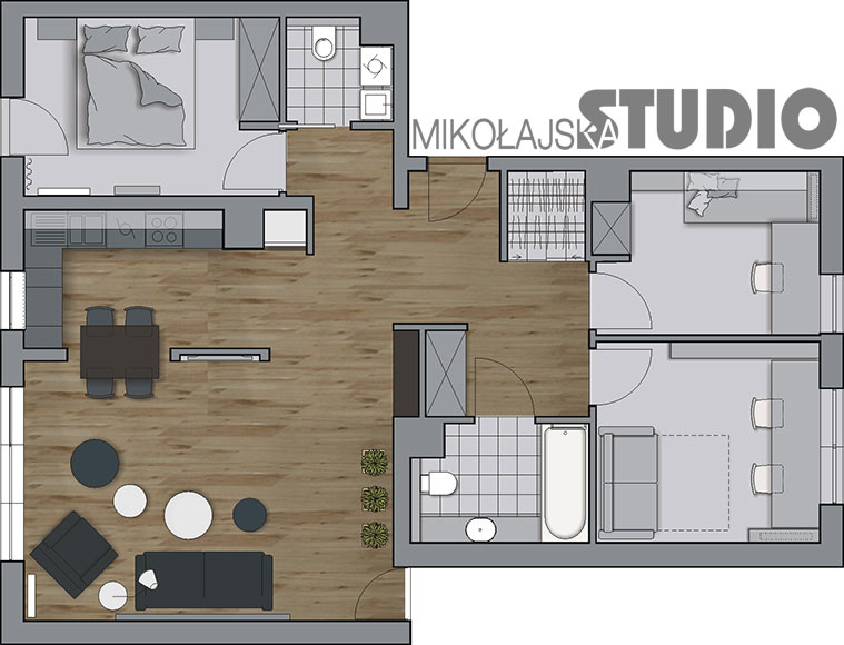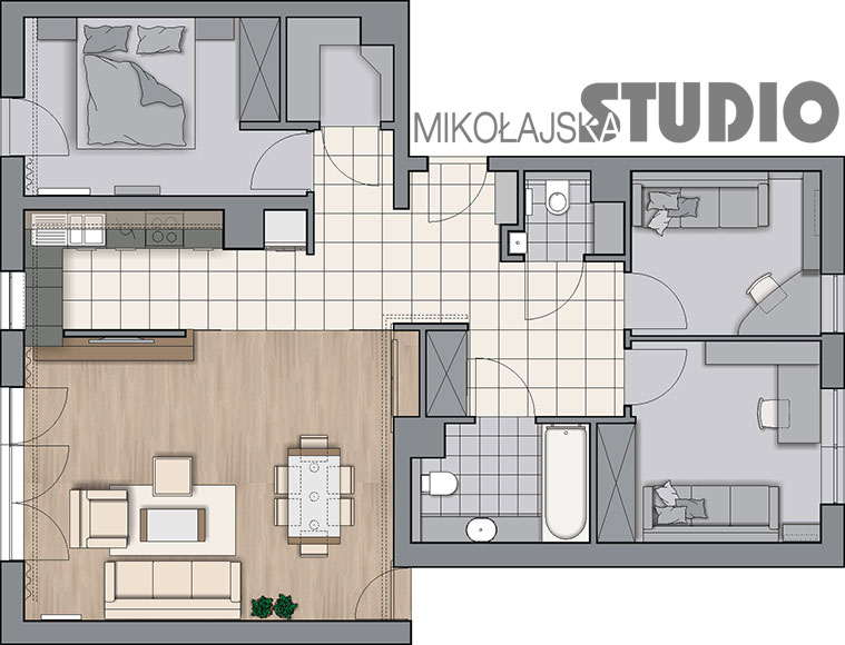 Tym razem postanowiłam pokazać nie tylko trzy rozwiązania stylowe i kolorystyczne, różne sposoby połączenia salonu i kuchni, ale dodatkowo jeszcze 3 wersje rozwiązania funkcji całego mieszkania. Mieszkanie ma 88 m2. Składa się z salonu z aneksem kuchennym, holu, trzech mniejszych pokoi, łazienki, wc i łazienki z prysznicem. W każdej z wersji rezygnuję z jednego pomieszczenia sanitarnego na korzyść garderoby.