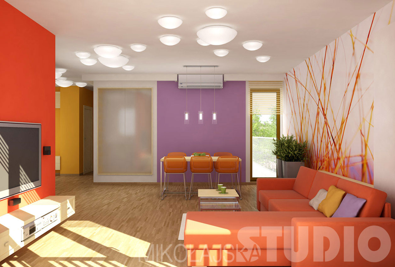 Zasadą projektu mieszkania jest, że każde pomieszczenie ma być w innym kolorze. Całość sprawia wrażenie wesołe i niewymuszone. Sypialnia rodziców ma kolor lawendowy, pokój chłopca – zielony, dziewczynki – różowy, łazienka jest pomarańczowa, przedpokój żółty. W salonie zastosowałam kilka kolorów: czerwony, żółty i fioletowy. Żółty jest kontynuacją holu, na fioletowo pomalowana jest ściana na wprost okna – za stołem. Na niej pod sufitem zamontowano wewnętrzną jednostkę klimatyzacyjną. Główna ściana na wprost wejścia oklejona jest fototapetą przedstawiającą trawy w dużym zbliżeniu i całkowicie zmienionej kolorystyce. Parkiet dębowy – mozaika przemysłowa, meble oklejone jasnym fornirem brzozowym. Układ funkcjonalny salonu zbliżony do poprzedniego. Różni się zastosowaniem pełnej ścianki pomiędzy salonem, a kuchnią. Na ściance zawieszony jest telewizor. To wersja dla osób które nie tolerują kuchni otwartej na salon. Układ szafek w kuchni jest zbliżony do rozwiązania w poprzednim projekcie, jedynie lodówka jest pod kątem prostym do ciągu kuchennego. Hol wygląda bardzo podobnie jak w poprzedniej wersji, jedynie przy ścianie między kuchnią, a holem wbudowana jest biblioteczka. Zastosowałam oryginalne oświetlenie w przedpokoju i salonie. Różnej wielkości okrągłe plafoniery rozrzucone po suficie. Zmienione jest wejście do sypialni – przesunięty otwór w ścianie konstrukcyjnej. (Każdorazowo w takim wypadku konstruktor powinien wykonać obliczenia, a właściciel zgłosić przebudowę odpowiedniej placówce). Dzięki temu powstało dodatkowe miejsce na jeszcze jedną szafę wbudowaną – gospodarczą. Sypialnia ma typowy układ, pomieszczenie obok wykorzystane jest na kąt do pracy – domowe dokumenty etc. Łazienka i wc są podobnie rozwiązane jak w poprzedniej wersji. Dwa najmniejsze pokoje położone koło siebie są przeznaczone dla dzieci. Jeden z nich jest naprawdę mały, ale po połączeniu ich rozsuwanymi drzwiami oboje dzieci zyskują miejsce do zabawy.
