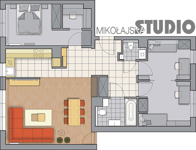 W pokoju obok salonu powstała sypialnia, powiększona o część pomieszczenia prysznica z wc. W części pomieszczenia prysznica z wc – garderoba. Łazienka pozostała bez zmian. Jest w niej wanna z prysznicem, długi blat z szufladami na kosmetyki, nad nim duże lustro powiększające optycznie łazienkę niemal dwukrotnie, Nad ścianką montażową geberitu duża, płytka trzydrzwiowa szafka na kosmetyki. Poniżej miska ustępowa z nakładką bidetową.