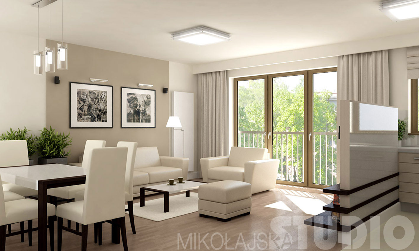 Taka architektura wnętrz zazwyczaj odpowiada zabieganym osobom, które chcą odpocząć po pracy w spokojnym otoczeniu. Kolorystyka łagodna, delikatna. Meble wykończone fornirem dąb bielony modyfikowany, podłoga z deski trójwarstwowej w kolorze beżowo-pudrowym. Ściany beż i ciepły popielaty – perłowy. Meble tapicerowane kolor śmietankowy z dodatkami drewna kolorze wenge. Na ścianie za stołem jasny kamień wapienny. Stół z blatem z satynowego szkła połączonego z drewnianymi elementami wenge. Płyta kartonowo – gipsowa pomalowana na popielaty kolor naklejona na ścianie za kanapą dobrze eksponuje powieszone na niej grafiki. Na tej samej ścianie zamontowany jest wysoki wertykalny grzejnik. (W mieszkaniu były dwa niskie grzejniki po obu stronach dużego okna uniemożliwiające zastosowanie zasłon). Pomiędzy salonem, a kuchnią zamontowana jest niska ścianka optycznie oddzielająca aneks jadalny od kuchni. Dzięki temu, że nie jest wysoka, pozostawia wrażenia jednej dużej przestrzeni salonu. Na ściance zamontowany jest telewizor. W oknach salonu zawieszone są zasłony, w kuchni i przy wyjściu na balkon stora rzymska z tej samej tkaniny. Przesunęłam w kierunku łazienki wnękę na szafę w holu. W ten sposób po dobudowaniu boku otrzymałam dodatkową wnękę od strony salonu. We wnęce powstał duży kredens całkowicie wbudowany w ścianę. Meble kuchenne są fornirowane tym samym fornirem co w reszcie mieszkania. Również fragment ściany pomiędzy ciągiem kuchennym, a lodówką jest wykończony fornirowaną płytą, by uzyskać efekt jednolitej płaszczyzny. W całym mieszkaniu zastosowałam białe drzwi i wysokie listwy przypodłogowe. W holu i kuchni na podłodze położone są jasne płytki.