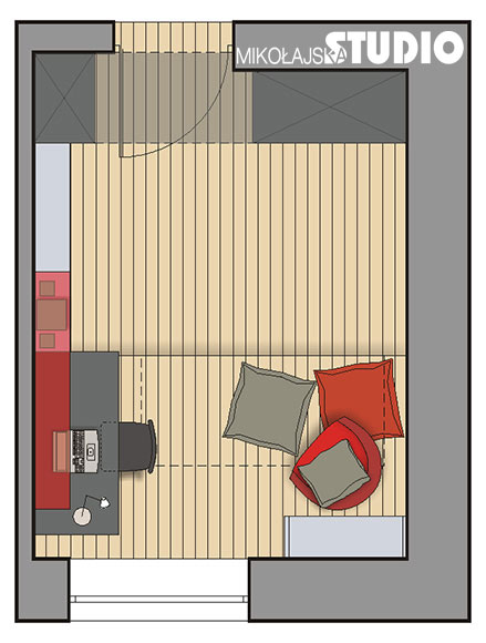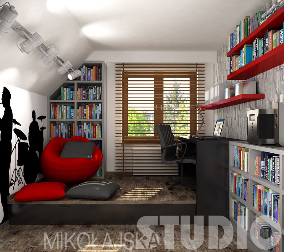 się przy biurku. Proponuję więc ustawienie biurka na podeście. Mebel jest umieszczony tak, że światło dzienne pada prawidłowo z lewej strony. Równocześnie stoi bokiem do drzwi wejściowych – to istotne, ponieważ człowiek czuje się bezpieczniej, gdy choć kątem oka widzi wejście do pomieszczenia. Okno zasłaniane jest drewnianą żaluzją. To wygodne rozwiązanie, ponieważ można regulować natężenie światła wpadającego do pokoju. Pod podestem jest jeżdżąca na kółkach wysuwana szuflada-łóżko. Można nie ścieląc, jednym ruchem wsunąć ją pod podest i… posprzątane. Do wygodnego siedzenia służy fotel sako, czyli worek wypełniony granulatem, układający się do ciała siedzącej osoby. Oprócz tego, gdy przyjdą znajomi, można usiąść na rozrzuconych na podeście poduchach. Czarne i popielate meble z płyty laminowanej zostały ożywione czerwonymi dodatkami. Na ścianie pod skosem są tematyczne naklejki, a naprzeciwko graficzna czarno-biała tapeta. Panele laminowane na podłodze imitują deski ze skrzynek na wino.