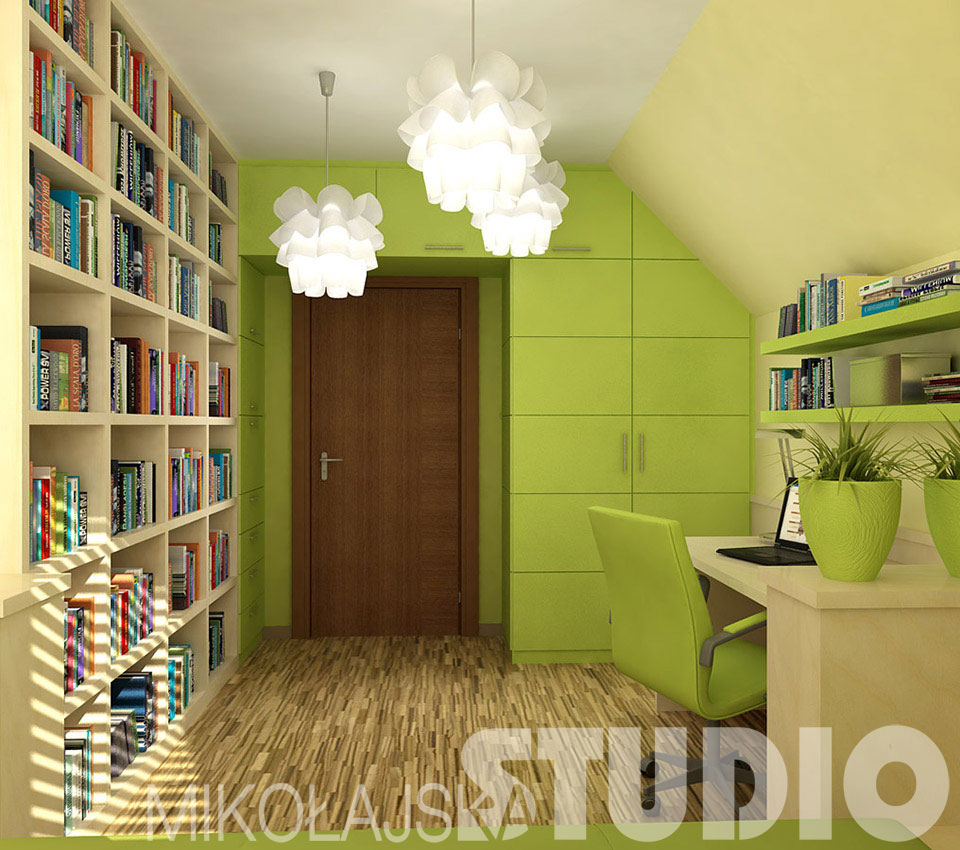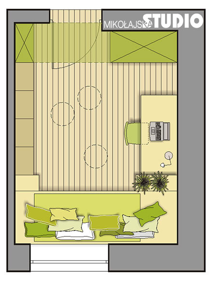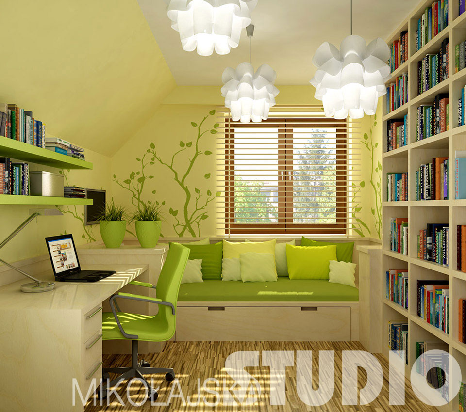 Mieszkanka tego pokoju lubi przyrodę, jasne, słoneczne kolory: zielony groszkowy, żółty. Często czyta na leżąco i tak też się uczy. Ma dużo książek. Dlatego pod oknem, na całą szerokość pokoju zaprojektowałam kąt wypoczynkowy – rodzaj podestu z materacem. Przyda się tu jak najwięcej poduszek, by wygodnie leżeć czy siedzieć opartym o ścianę i czytać przy świetle dziennym. Stąd można też oglądać telewizję (telewizor wisi na ścianie pod skosem). By lepiej zagospodarować to miejsce, przeniosłam grzejnik spod okna na boczną ścianę.