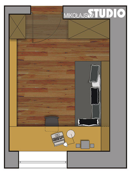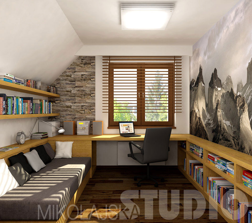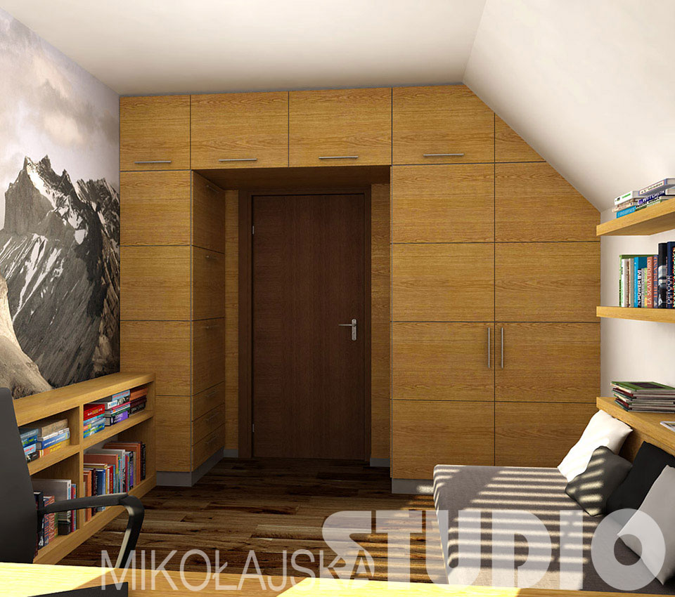 Karol jest typem indywidualisty i introwertyka. Dobrze czuje się w górach, które dają mu poczucie wolności i swobody. Lubi proste rozwiązania, naturalne materiały, spokojne, stonowane kolory. Pracuje przy biurku, potrzebuje na nim dużo miejsca, bo wokół siebie rozkłada materiały do nauki. Dlatego w tym projekcie najważniejsze jest wygodne miejsce do pracy. Pod oknem, na całej szerokości pokoju proponuję duży blat wykonany na wymiar. Jest bardzo dobrze doświetlony światłem dziennym, choć muszę przyznać, że takie usytuowanie ma też wadę – siedząca tu osoba ma za plecami wejście do pokoju, co nie jest najszczęśliwszym rozwiązaniem. Obok blatu, przy jednej ścianie stoi tapczan, przy drugiej są niskie półki na książki. Poduszki na tapczanie opiera się o płytką skrzynię-schowek, zamykaną półką na drobiazgi potrzebne przy łóżku. By mieszkający tu miłośnik gór czuł się jak najlepiej, na jednej ścianie zaproponowałam tapetę z widokiem gór. Idealnie pasują do niej tapicerka tapczanu i poduszki utrzymane w odcieniach szarości. Meble wykończone są fornirem dębowym. Na podłodze ciemnobrązowe deski.