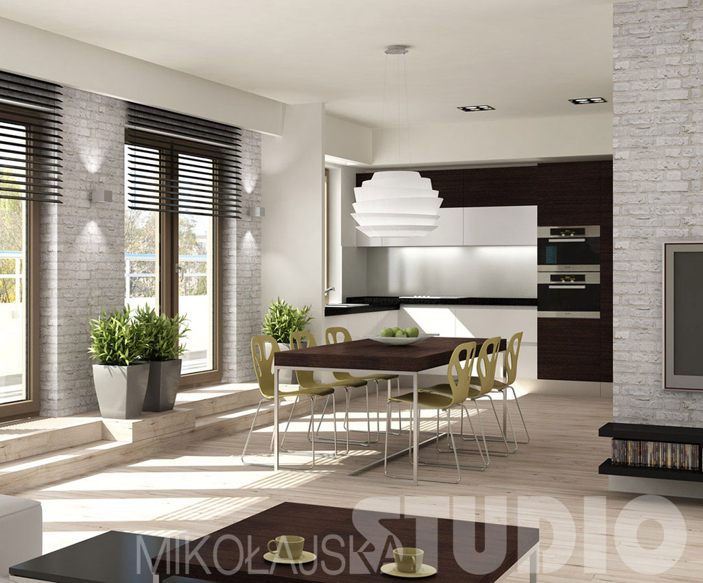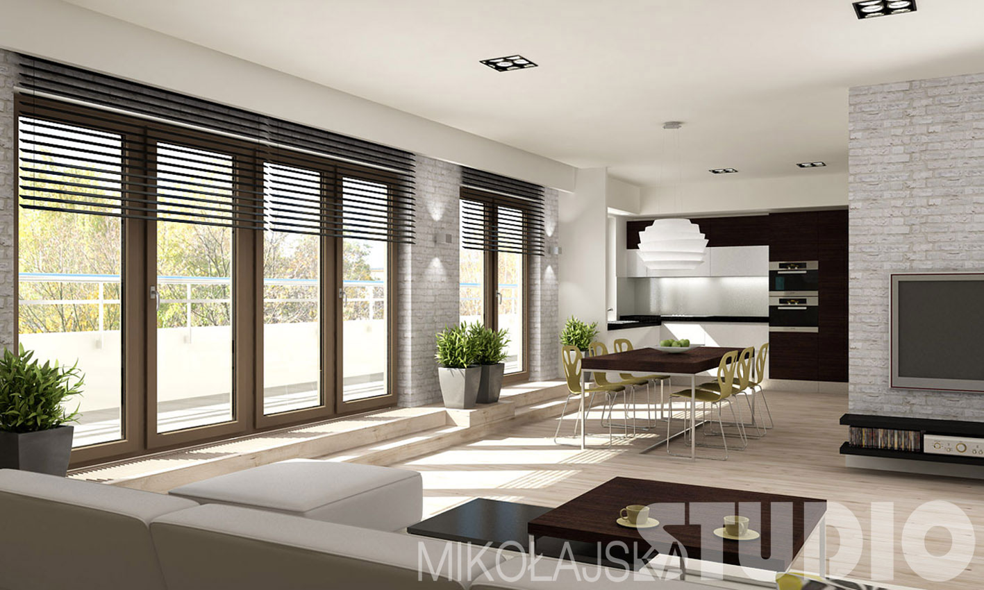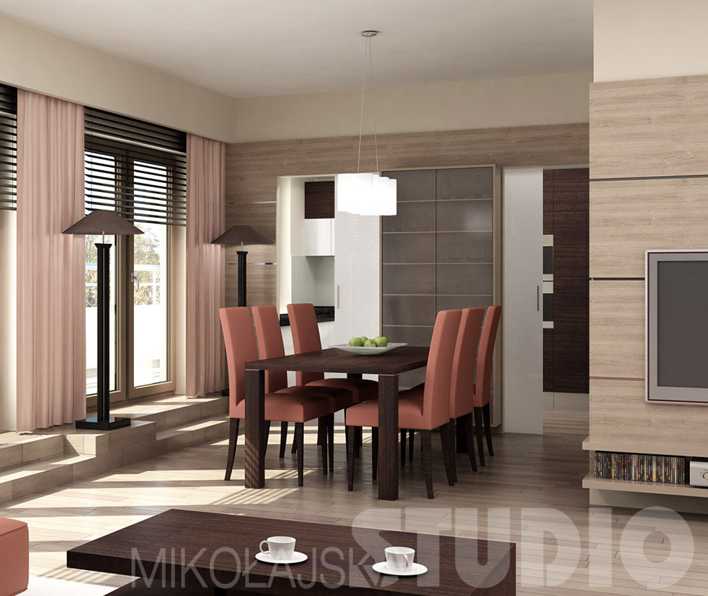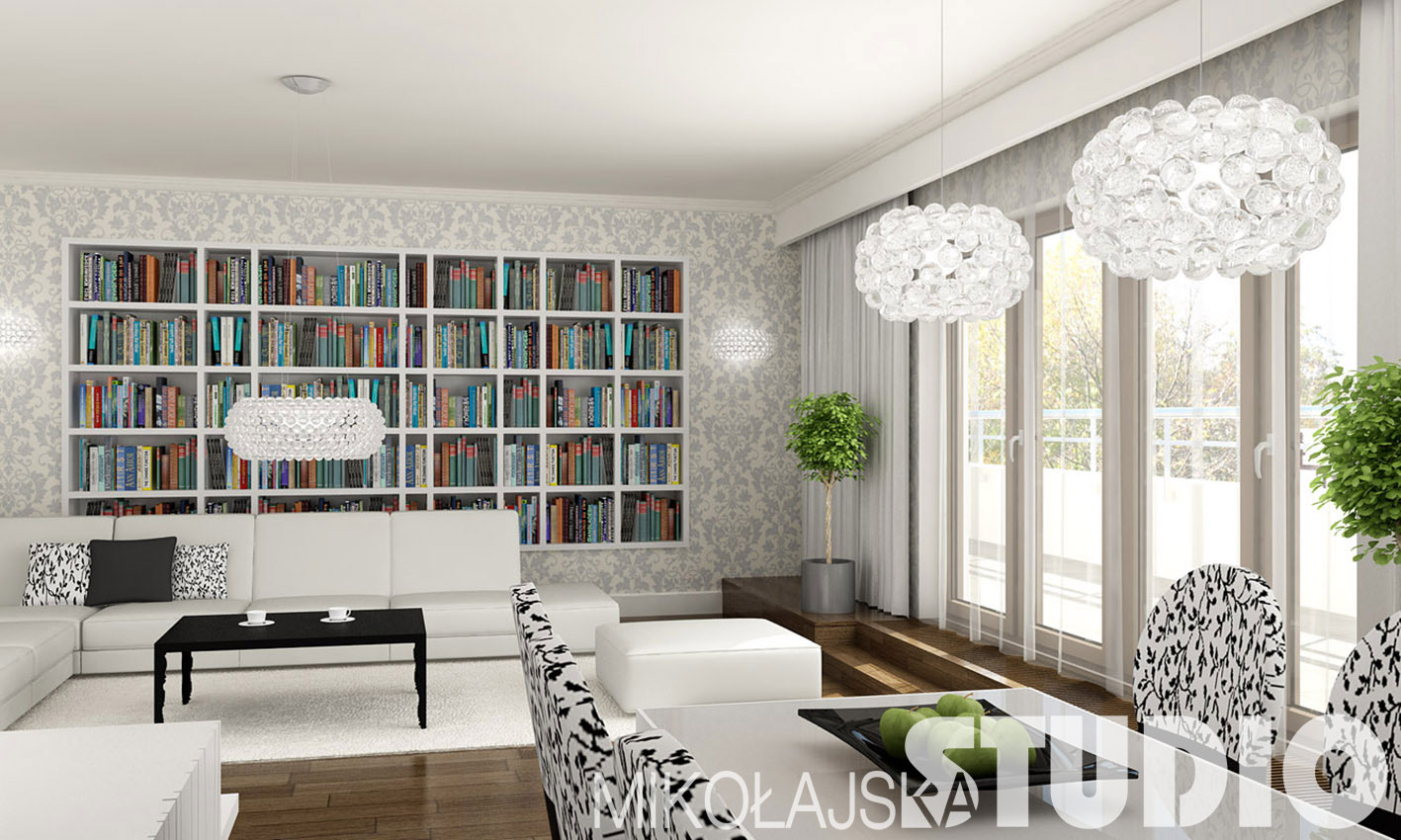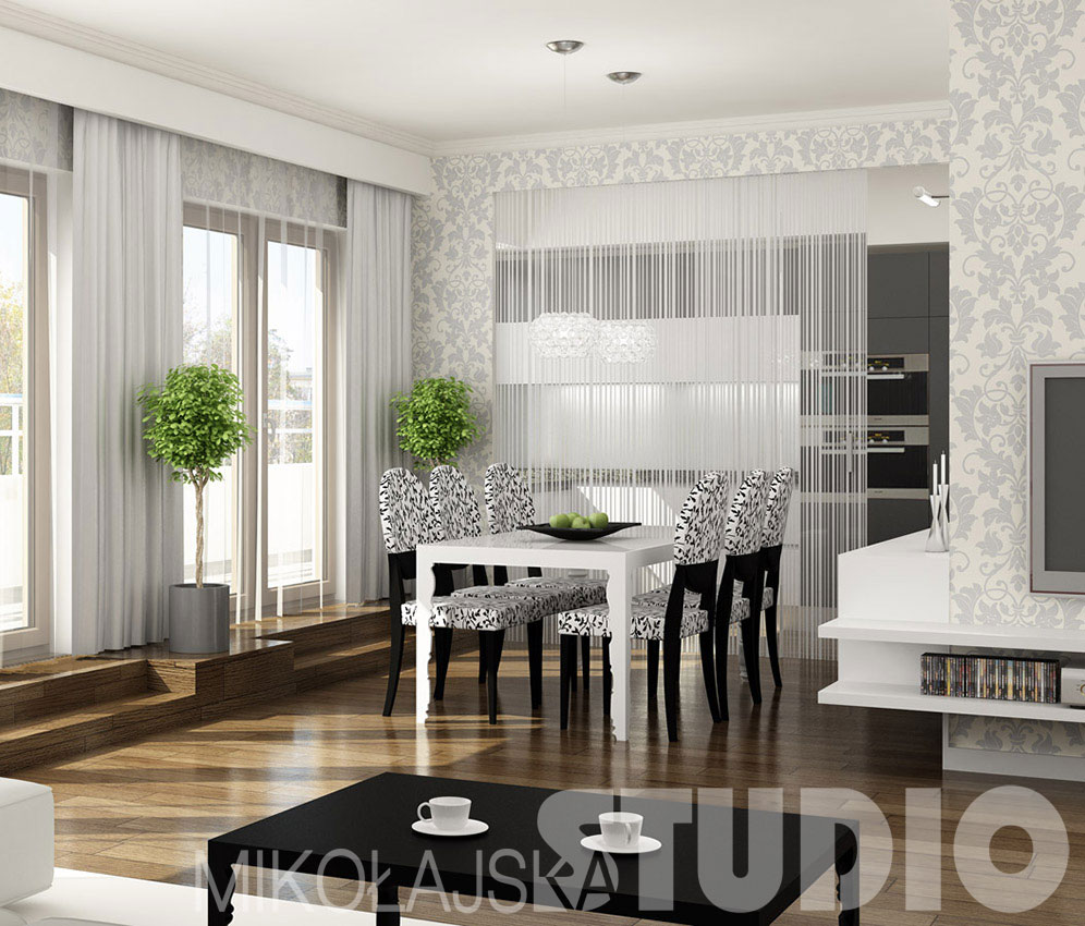 Meble z nutką eklektyzmu – ale z przymrużeniem oka. Stół nawiązuje do stylowego mebla, ale jego nogi wyglądają tak, jakby klasyczny toczony element został rozcięty na kawałki i fragment tego elementu został użyty. Krzesła to też „Ludwiki” ale raczej impresja na temat stylu, niż jego wierne odtworzenie. Wnętrze jest bardzo jasne, dzięki białym meblom i jasnej srebrzysto – białej tapecie, więc mimo dość ciemnej podłogi wciąż wygląda przestronnie. Pomiędzy salonem, a kuchnią zamontowana jest tafla ze szkła hartowanego. Fragment tafli jest przesuwny – stanowi wejście do kuchni. Szkło jest piaskowane w pionowe nierównomierne pasy. Daje to efekt lekkości przesłony. Kuchnia jest częściowo widoczna poprzez przeźroczyste fragmenty szkła, ale nie przykuwa wzroku, bo na pierwszym planie znajduje się optyczna przegroda.
