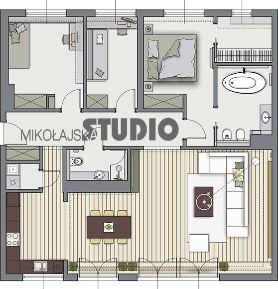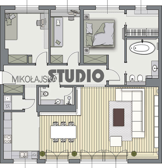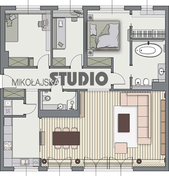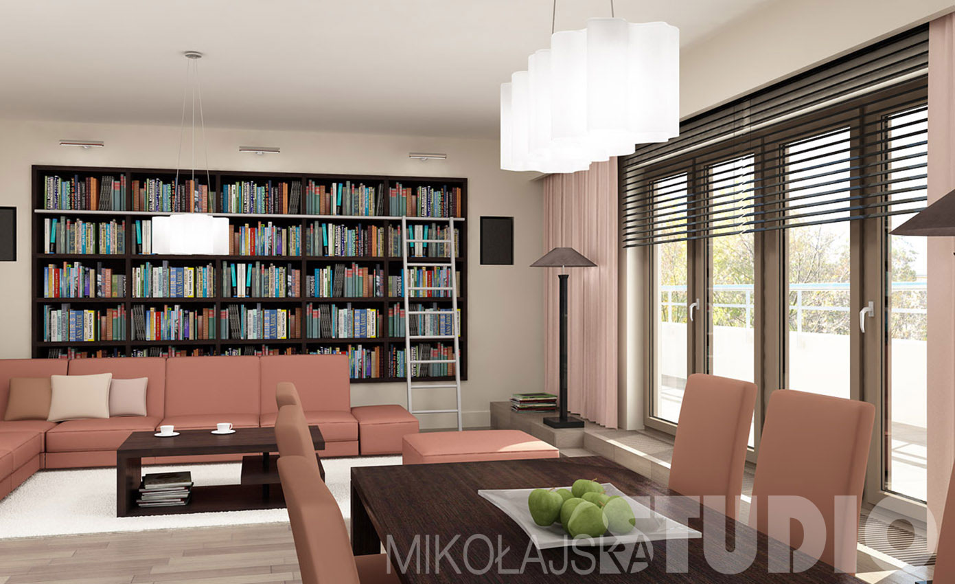 Projektowane mieszkanie o powierzchni 119 m2 znajduje się w budynku wielorodzinnym. Nie wprowadziłam w nim radykalnych zmian. Powiększyłam pokój dziecięcy kosztem gościnnego w którym tylko sporadycznie będzie ktoś nocował, wydłużyłam nieco pomieszczenie w.c. z prysznicem, wygospodarowałam z kuchni małe pomieszczenie gospodarcze, Powiększyłam łazienkę kosztem garderoby, by móc w niej umieścić wolnostojącą wannę i połączyłam sypialnię rodziców, łazienkę i garderobę w odrębną prywatną przestrzeń. Dziecko będzie korzystało z małej łazienki dostępnej z holu. Salon ma powierzchnię 37,2 m2, a kuchnia 9,2m2. Duże okna w salonie są bardzo atrakcyjnym elementem architektonicznym. Niestety pomiędzy nimi zamontowane były zwykłe grzejniki, szpecące wnętrze i uniemożliwiające zawieszenie zasłon, czy umieszczenie dekoracyjnych elementów. We wszystkich wersjach projektu zastosowałam ogrzewanie kanałowe w stopniach prowadzących na balkon. Dzięki temu elementy grzewcze są niewidoczne.
