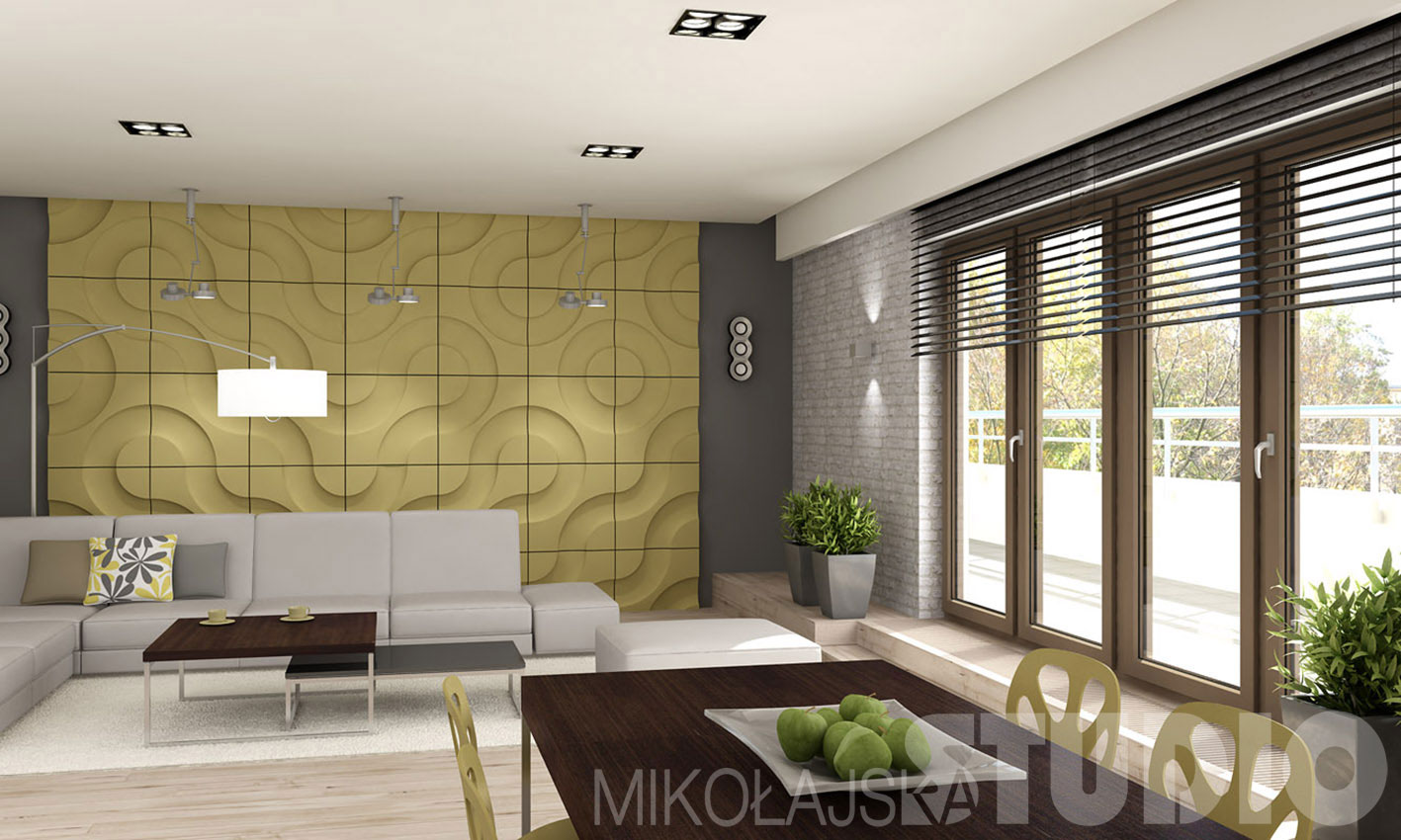 Proste, ale efektowne urządzenie salonu i kuchni – w pełni otwartej i połączonej z salonem. Najbardziej przestrzenne rozwiązanie. W salonie na ścianach zastosowałam okładzinę ceglaną imitujących starą ceglaną ścianę. Nadaje wnętrzu charakter „loftu”. Podłoga zrobiona jest z olejowanych, bielonych desek. Na ciemnym tle przeciwległej do kuchni ściany – za narożną sofą, umieściłam kompozycję z pomalowanych paneli Loftsystem wykonanych z kompozytu na bazie gipsu. Pomimo surowego charakteru wnętrze nie robi wrażenia „zimnego”., dzięki wprowadzeniu do niego koloru i roślin.